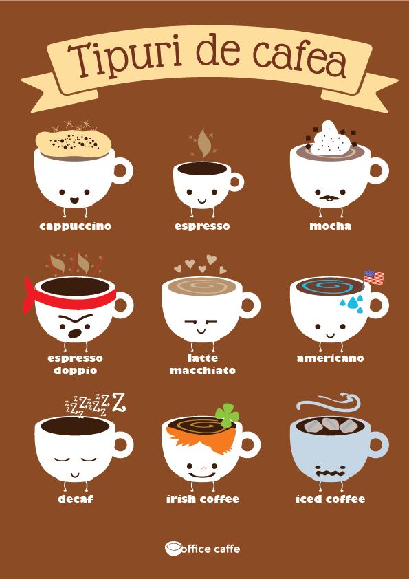 - Mochaccino – o cafea de tip Caffe Latte, căruia i se adaugă ciocolată rasă, sirop sau ciocolată pudră. Poate fi servită și cu frișcă.